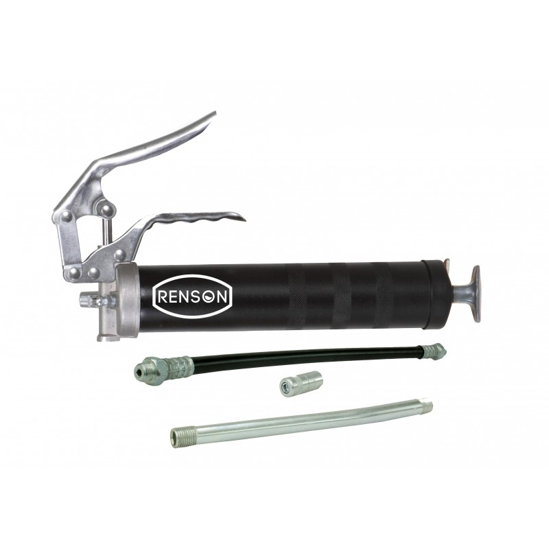 Pistol manual de gresat profesional pentru o mana cu furtun flexibil din poliamida de 300 mm, tija rigida de 150 mm si conector hidraulic.
